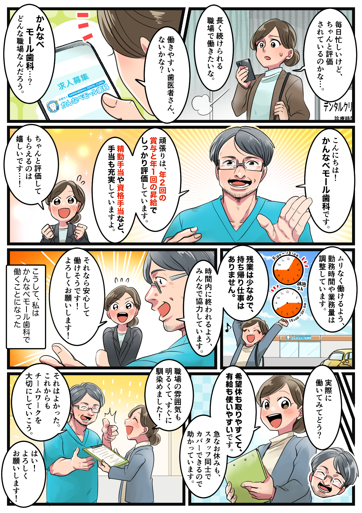 かんなべモール歯科を選んだ理由は、人間関係が良いところ、そして休みが取りやすい歯科医院に就職したいと思っていました。最初はパートだったのですが、先輩方が優しく、みんなでご飯に行ったりと馴染みやすい職場の雰囲気です♪